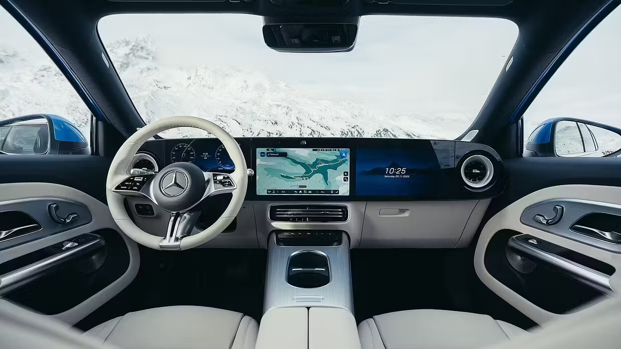 새 GLB의 실내는 CLA와 공유하는 MMA 플랫폼 기반으로 구성된다. 가장 눈에 띄는 요소는 MBUX 슈퍼스크린으로, 운전석부터 조수석까지 이어지는 3연속 디스플레이가 적용된다. 내비게이션은 구글 맵스 기반으로 개편됐으며, 음성 제어는 차세대 AI 지원 기능을 갖췄다. 마이크로소프트의 GPT·빙 기술과 구글의 제미나이 및 맵스 데이터가 결합돼 자연어 질의·맞춤형 제안 기능을 제공한다.