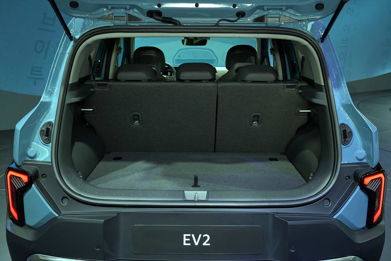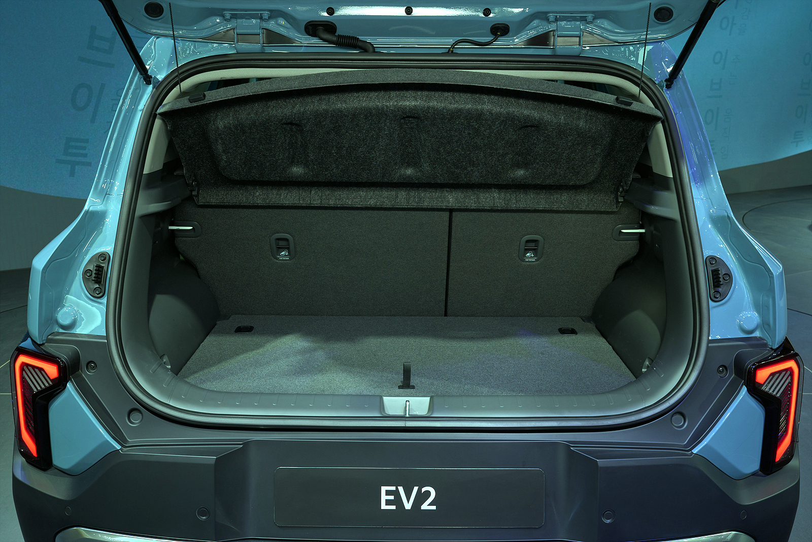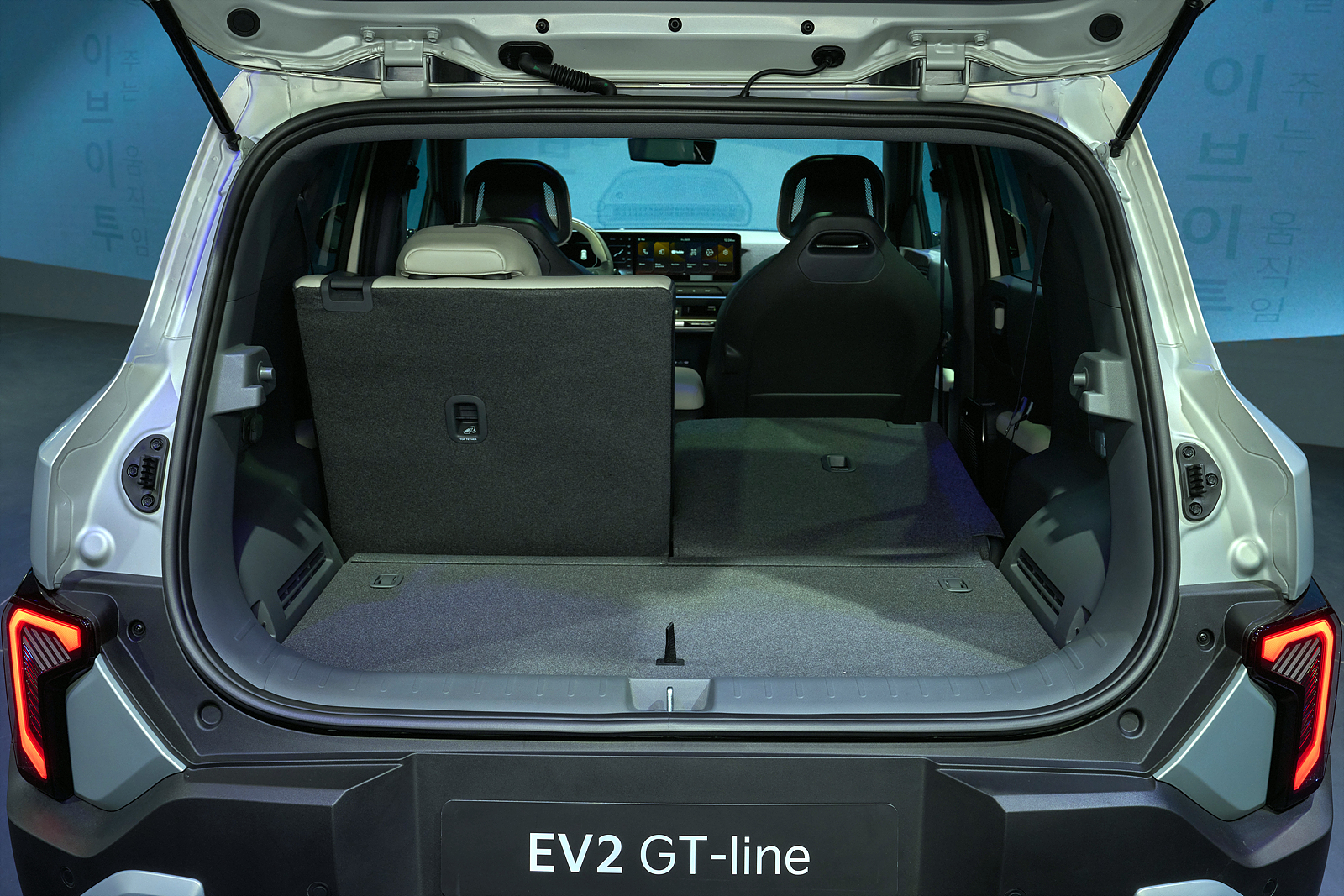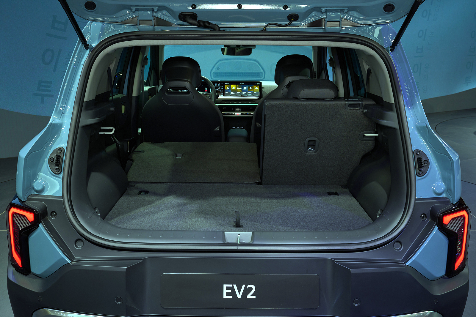 EV2의 전장은 4,060mm, 전폭 1,800mm, 전고 1,575mm다. 기아 EV3(4,300mm)보다 약 240mm 짧아 기아 전기차 중 가장 콤팩트하다. 현대 인스터와 비슷한 체급이지만, 휠베이스는 2,565mm로 확보해 실내 공간을 극대화했다.