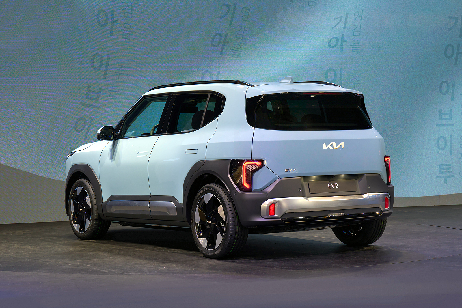 EV2는 기아의 ‘오퍼짓 유나이티드(Opposites United)’ 디자인 철학을 따른다. EV6, EV9 등 대형 전기차에서 영감을 받은 수직형 주간주행등, 기아 최신 스타 맵 라이트 시그니처, 강조된 숄더 라인, 견고한 휠 아치가 특징이다. 16인치부터 19인치까지 휠 옵션을 선택할 수 있고, 솔리드, 메탈릭, 펄, 매트 등 다양한 외장 컬러가 제공된다.