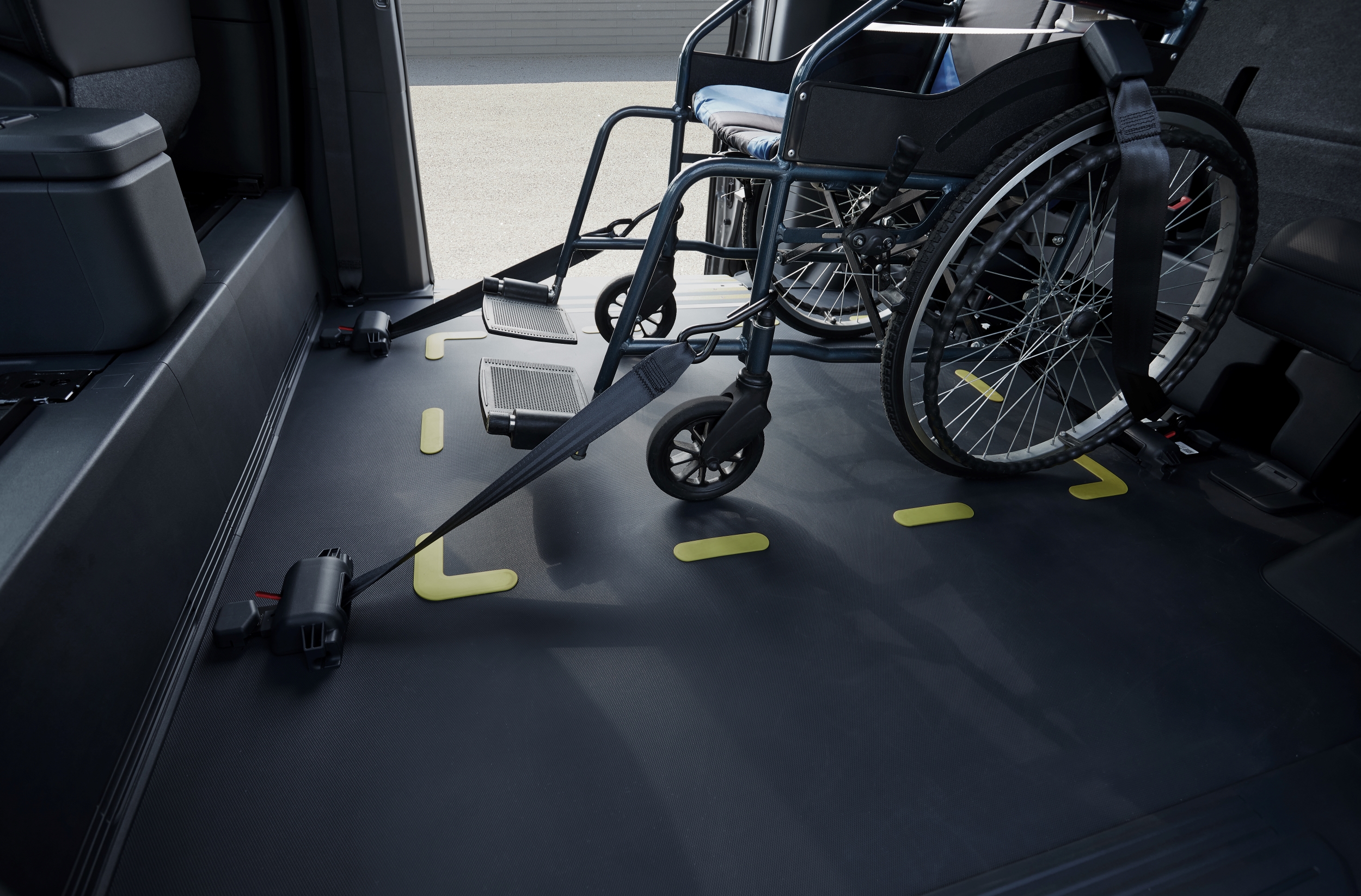 휠체어 전후방 고정장치와 휠체어 전용 3점식 안전벨트가 기본 적용됐으며, 뒷좌석에는 6:4 폴딩·리클라이닝 기능의 쿠션 팁업 시트를 적용해 휠체어 승객과 동승자가 나란히 이동할 수 있도록 설계됐다. 매뉴얼 에어컨과 후석 대화 모드도 탑재됐다.