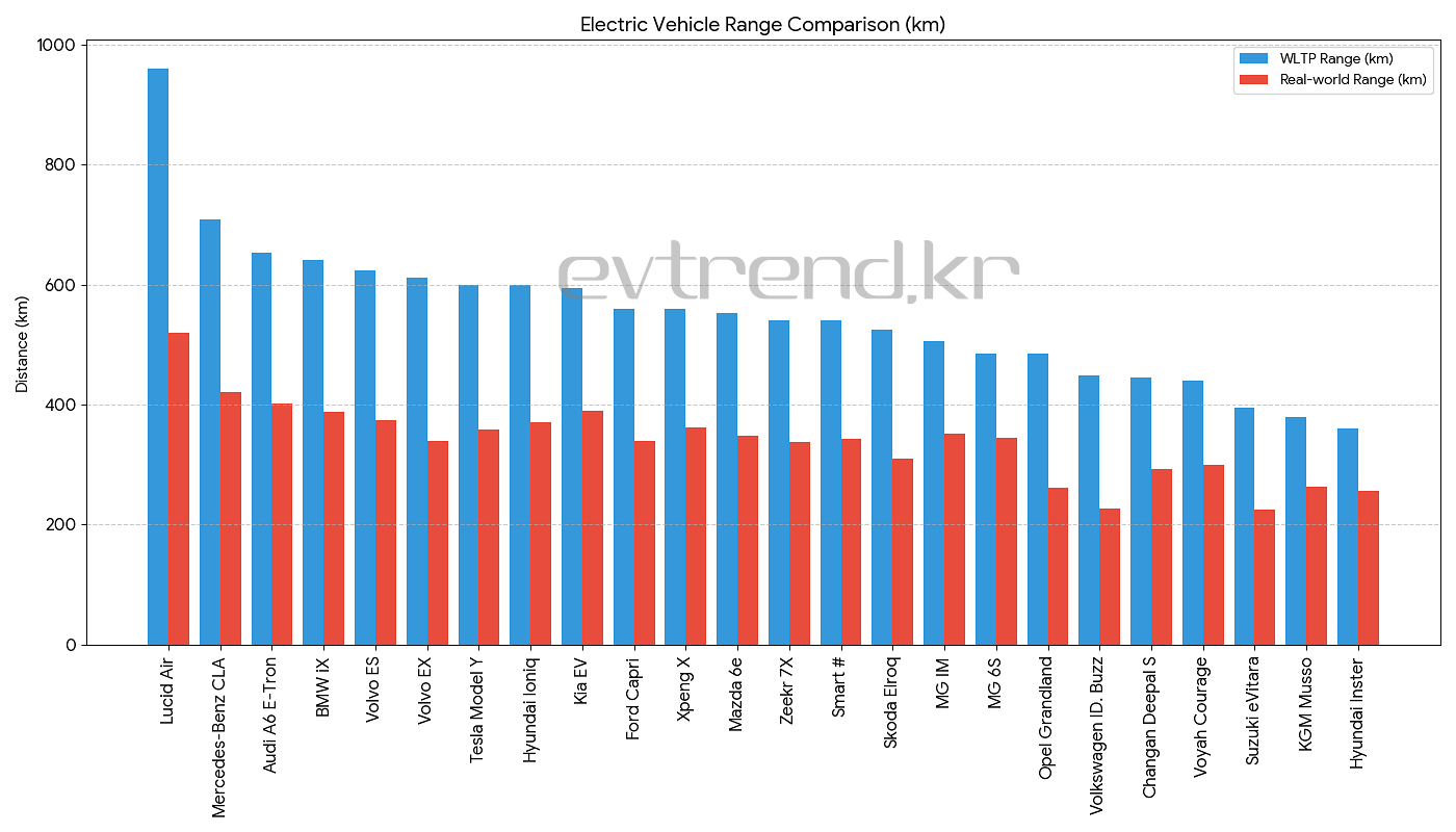 절대 주행거리에서는 루시드 에어가 520km로 1위를 차지했다. 그러나 WLTP 공인 960km 대비 46%나 손실을 보며, 편차율에서는 참가 차량 중 최하위권에 머물렀다. 볼보 EX90, 오펠 그랜드랜드, 스즈키 e비타라도 비슷한 양상을 보였다.