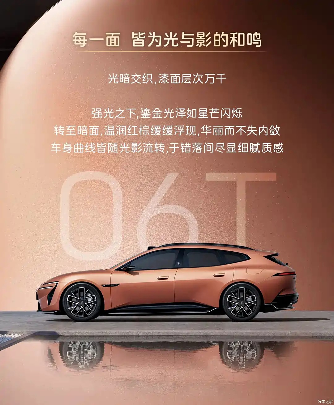 06T의 전장은 4,940mm로 06 세단(4,855mm)보다 85mm 길다. 전폭 1,960mm, 전고 1,475mm, 휠베이스 2,940mm로, 수치만 보면 스포티한 로우 스탠스를 지향했음이 분명하다. 전고 1,475mm는 오프로드형 크로스오버와는 거리가 멀고, 포르쉐 파나메라 스포트 투리스모나 아우디 A6 아반트처럼 지면을 바짝 누르는 퍼포먼스 왜건에 가깝다.