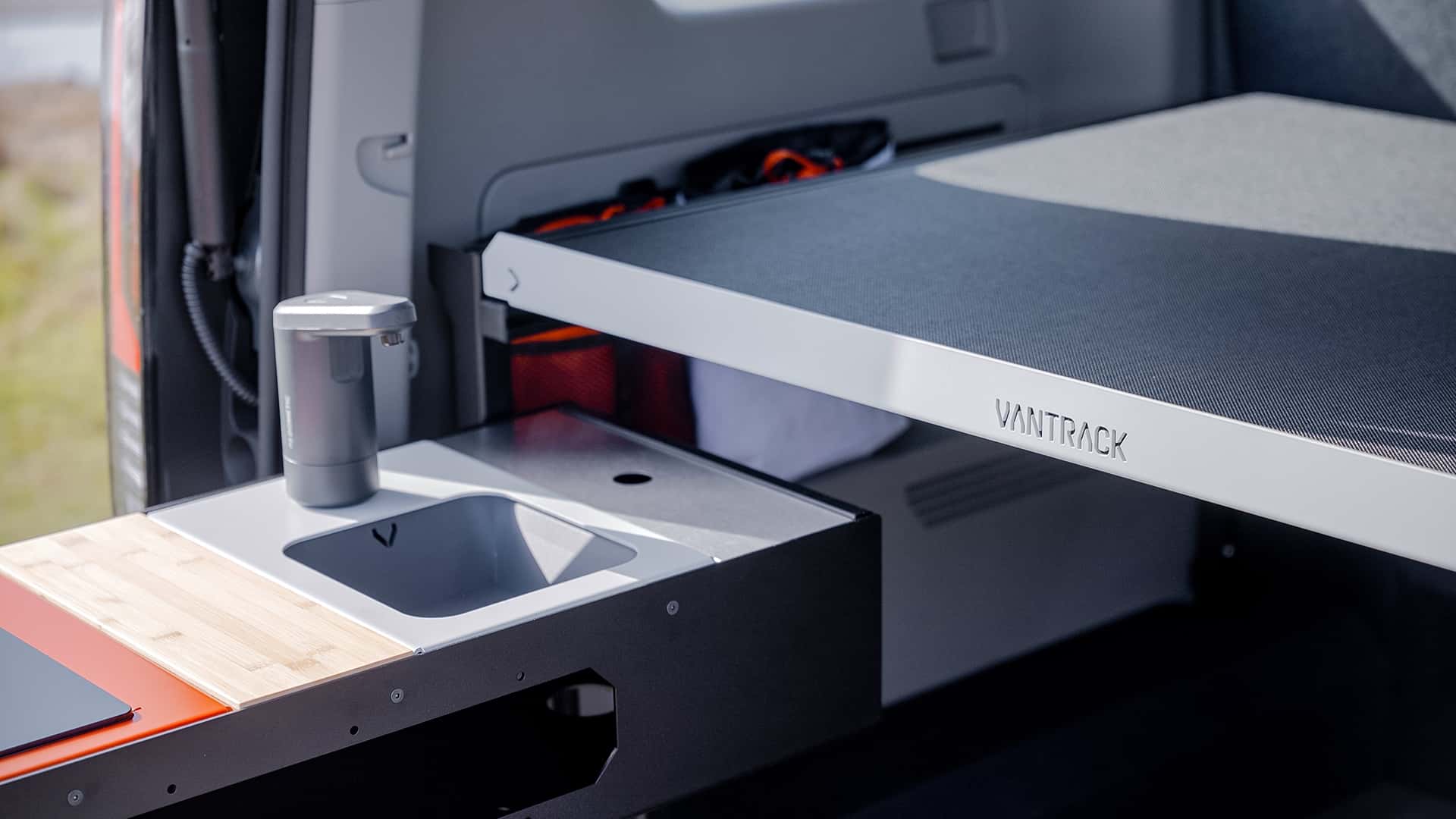 후면 도어를 열면 외부로 펼쳐지는 주방 모듈이 드러난다. 인덕션 조리기기와 싱크대, 작업대를 하나로 묶었다. 별도 장비 없이도 간단한 조리를 바로 시작할 수 있는 구성이다.